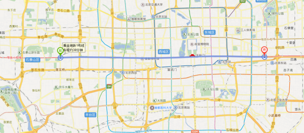 從玉泉路-地鐵站,到大望路-地鐵站,有地鐵1號線直達,全稱大約40分鐘。